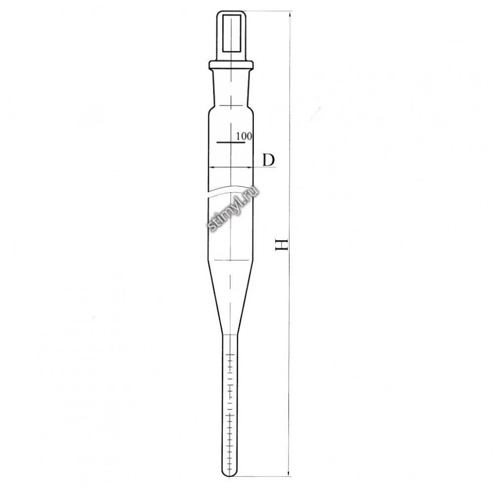 | Шифр | Номин. вмест., мл | Вместимость градуир.части, мл | Цена делен. шкалы, мл | Шлиф КШ по ГОСТ8682-93 | D мм | H мм |