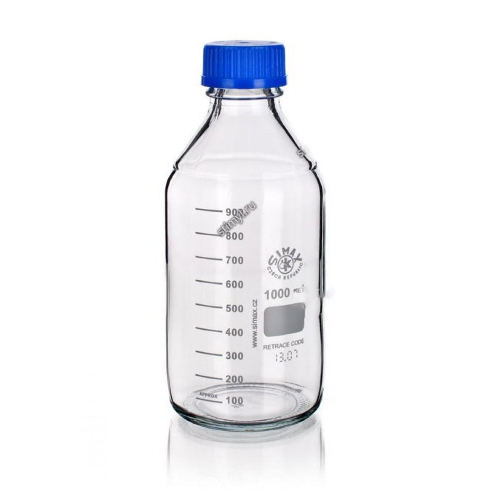 Банка для реактивов из прозрачного стекла SIMAX с винтовой пластмассовой крышкой используется для хранения химических жидкостей.
