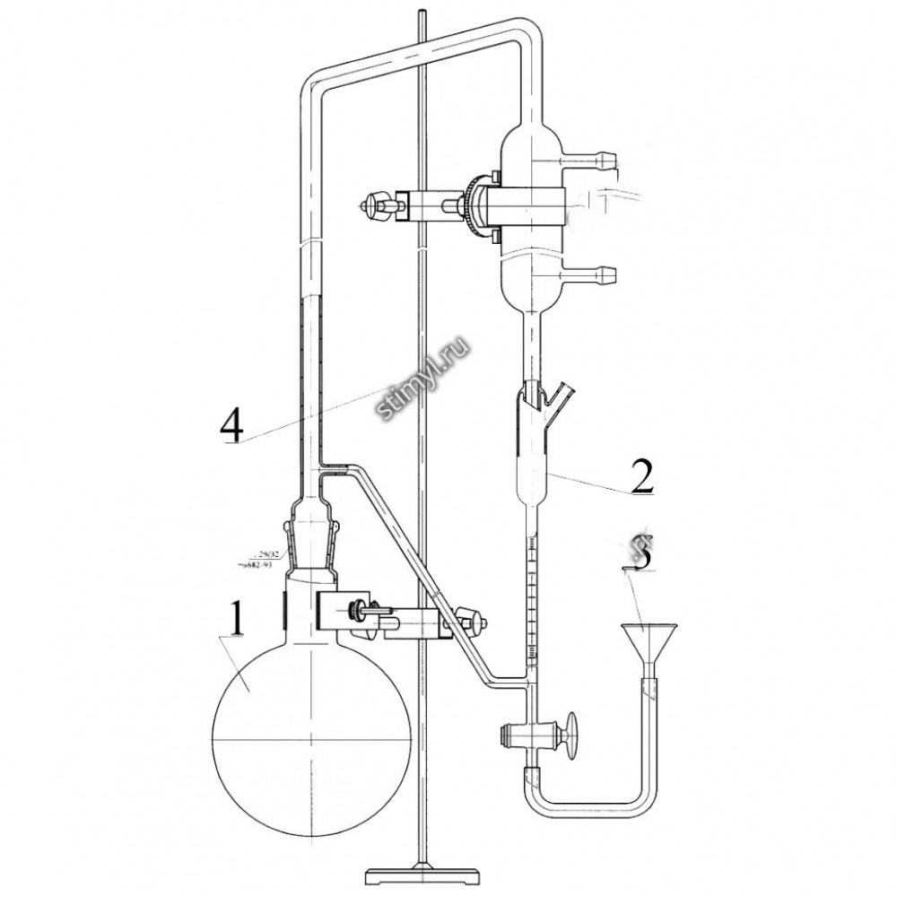 Прибор предназначен для определения содержания эфирного масла в растительном сырье по методу Клевенджера путем перегонки его с водяным паром и последующего измерения объема полученного масла, выраженного в процентах по отношению к абсолютно сухому сырью. Методики проведения испытания и расчета по ГОСТ 24027.2-80.Прибор состоит из: