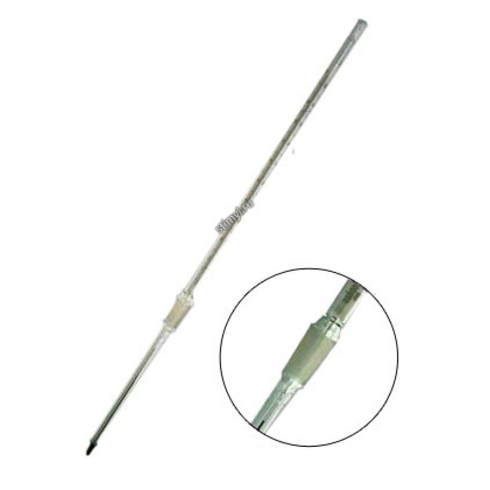 Термометр ТЛ-50 лабораторный с конусным шлифом для измерения температуры в лабораторных узкогорлых сосудах. Термометр лабораторный с конусным шлифом.Термометр для измерения температуры в лабораторных узкогорлых сосудах.Изготавливается по ТУ25-2021.007-88.Имеет «Сертификат об утверждении типа средств измерений».КонструкцияСтеклянный термометр с вложенной шкальной пластиной из молочного стекла, с конусным нормальным шлифом 14/23, расположенным в нижней части термометра.Длина верхней части термометра 260±10 мм.Длина нижней части термометра 60,80,100,125,180,200,250,300 мм.Диаметр оболочки: в.ч 10±1 мм, н.ч. 7±0,5 мм.